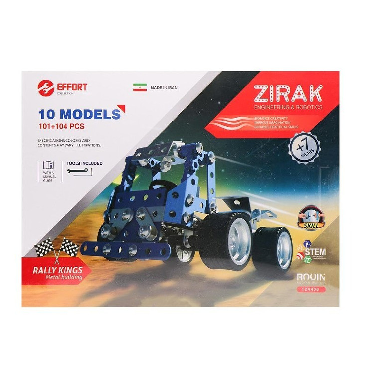 سازه فلزی زیرک یک سازه جذاب و سرگرم کننده برای کودکان و نوجوان های خلاق و باهوش است این سازه فلزی دارای 205 قطعه می باشد.سازههای فلزی زیرک وسایل علمی، آموزشی، مهندسی و سرگرمی هستند. سازهی پیشرفته ی 10مدل مجموعهی کوشش است که شامل مدلهای نسبتاً پیچیده و خلاقانه ساختنی میشود. این سازه حاوی 205 قطعه است که میتوان با استفاده از راهنمای درون جعبه 10 مدل مختلف سازه با آنها ساخت و البته با استفاده از خلاقیت خود میتوان مدلهای متنوع دیگری خلق کرد. سازههای فلزی با تلفیق بازی و مهندسی مهارتهای مختلفی را تقویت میکنند. از مهمترین مهارتها میتوان به تقویت ماهیچههای ظریف دست و کار با ابزار، هماهنگی چشم و دست، نقشه خوانی و آشنایی با مکانیزمهای مهندسی اشاره کرد.