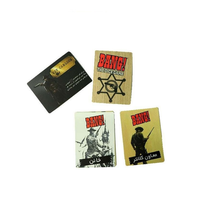 محتویات بازی تاسی بنگ: 5 تاس مخصوص 30 کارت شامل کارت شخصیت و کارت نقش و کارت توضیحات 9 عدد توکن تیر 40 عدد توکن گلوله قوانین بازی