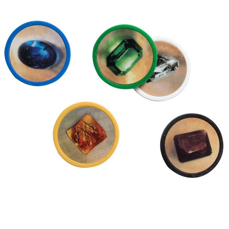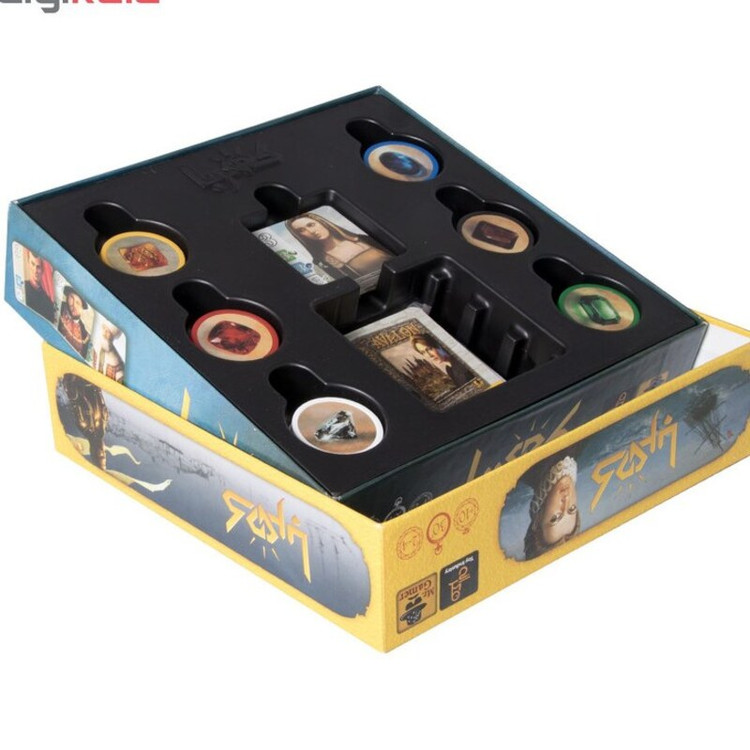 محتویات جعبه • 40 ژتون پلاستیک فشرده با عکسهای جواهرات شامل 7 ژتون از هر رنگ جواهر (7×5) به همراه 5 ژتون طلا (با رنگ زرد) • 90 کارت بازی در سه دسته (40، 30 و 20 تایی) • 10 تایل مربعی اشرافزادگان • دفترچه قوانین بازی