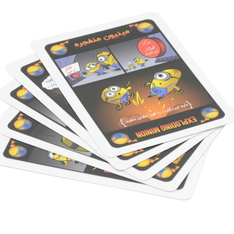 مینیون ها وارد دنیای گربه های انفجاری شدهاند. بازی مینیون های انفجاری یک بازی استراتژیک کارتی است که در آن بازیکنان تا زمانی که یک نفر کارت مینیون منفجره را بردارد، از مخزن کارتها، کارت برمیدارند. اگر کسی کارت منیون منفجره را بردارد، منفجر میشود؛ مگر اینکه کارت خنثی کننده داشته باشد. کارت هایی که مینیون ها به دنیای گربه های انفجاری اضافه کردهاند، جذابیتهای خاصی را به این بازی اضافه کرده است. مینیون های انفجاری برای جمعهای 2 تا 6 نفره و کودکان، نوجوانان و بزرگسالان طراحی شده است. در این بازی شخصیتهای معروف سری انیمیشنهای مینیون ها یعنی باب، استورات، کوین و اوتو حضور دارند و باعث شدهاند تا کارتهای این بازی بسیار بانمک به نظر برسد. محتويات اين بسته شامل 73 کارت بازي و راهنماي بازي مي باشد.