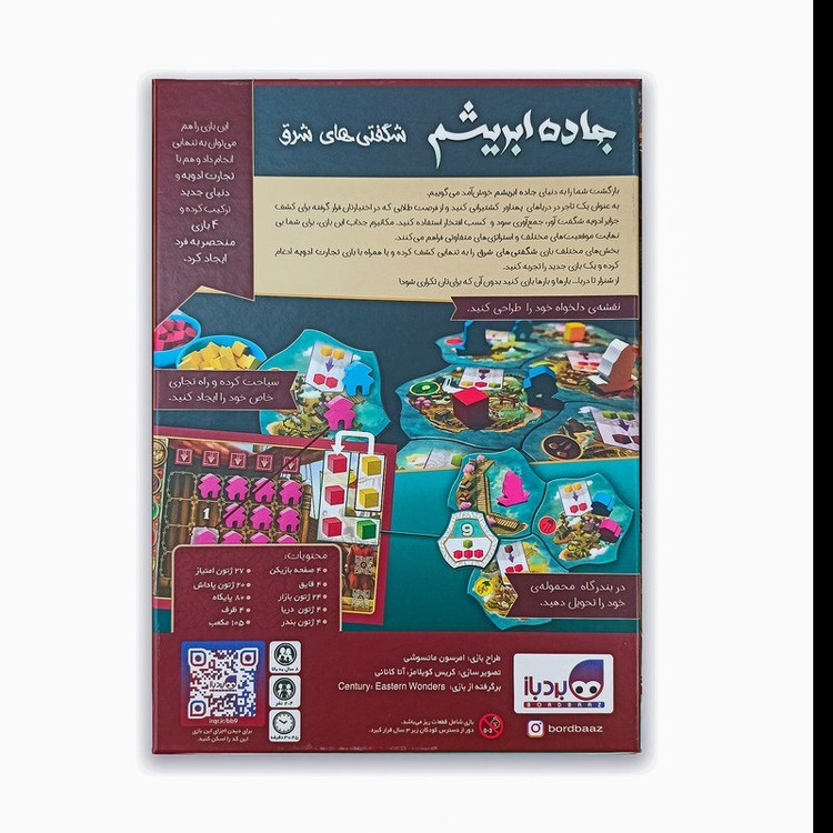 بازی جاده ابریشم شگفتی های شرق بر اساس بازی جذاب و موفق Century (Eastern Wonders) میباشد .این بازی یکی از بهترین بردگیم های دنیا در سبک بازی های استراتژیک سبک و خانوادگی است. در این بازی شما به عنوان یک تاجر در دریاهای پهناور کشتیرانی می کنید و از فرصت طلایی که در اختیارتان قرار گرفته برای جمع سود آوری ، کسب افتخار و کشف جزایر شگفتآور شرقی که دارای ادویه هایی ارزشمند هم وزن طلا است تلاش می کنید مکانیزم جذابی که این بازی دارد برای شما بی نهایت موقعیت های مختلف و استراتژی های متفاوتی فراهم می کند. این بازی نسخه دومین بازی از سه گانه جذاب جاده ابریشم است که دارای گیم پلی کاملا متفاوت با 2 سری دیگر است همچنین قابلیت ادغام با دو بازی تجارت ادویه و دنیای جدید را دارد که با هر کدام از آن ها می توانید یک بازی جدید بسازید.