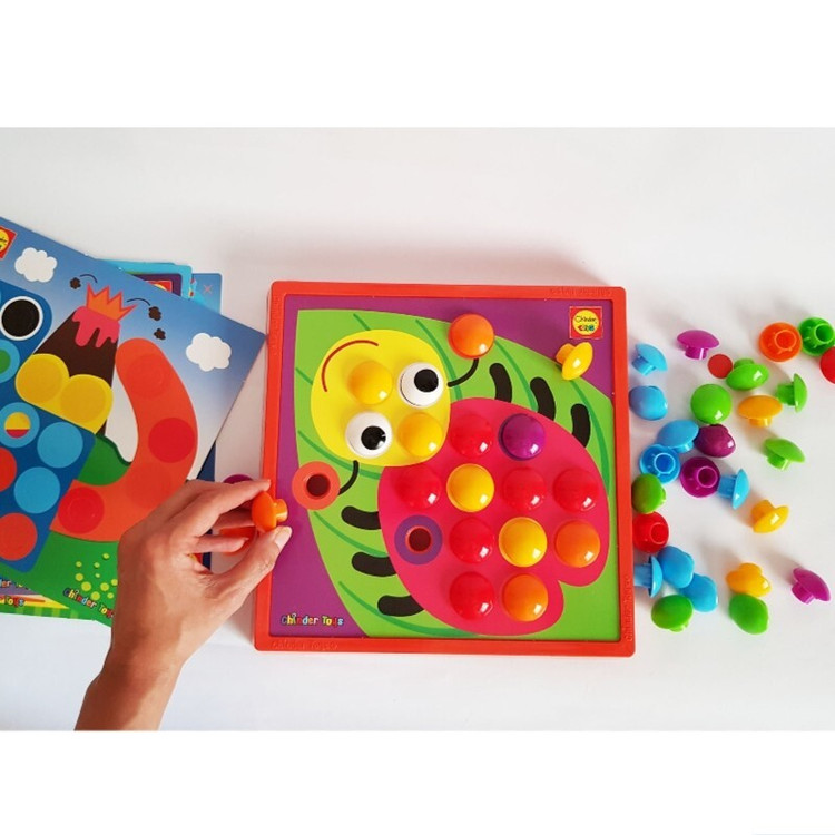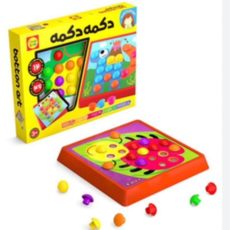 اسباب بازی دکمه دکمه،یک اسباب بازی فکری و مهارتی است که کودک می بایست تصاویر صفحات را با استفاده از دکمه ها کامل کند. این اسباب بازی 12 صفحه با طرح های متنوع دارد که به خوبی قوه ی تخیل و تفکر کودک را تقویت می کند.هر صفحه روی پایه قرار گرفته و طرح بوسیله ی دکمه هایی که روی صفحه قرار می گیرد کامل می شود. در واقع کودک می بایست تصاویر را با دکمه ها بسازد.