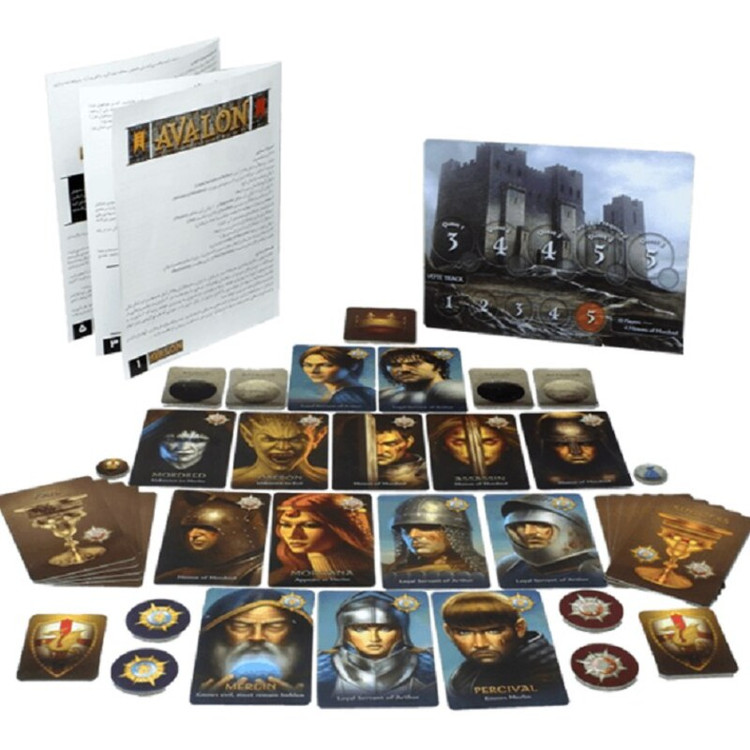 اجزاء بازی 14 کارتِ شخصیت: مِرلین، پِرسیوال و 5 یارِ وفادارِ آرتور (Loyal Servant of Arthur) موردرِد، آدمکُش، مورگانا، اوبِران و 3 سرسپُردهی موردرِد (Minion of Mordred) 1 توکنِ فرمانده (با نشانِ تاج) 5 توکنِ گروه (با نشانِ سپر و اژدها) 20 توکنِ رأی (10 توکنِ رأی موافق (Approve) و 10 توکنِ رأی مخالف (Reject)) 10 کارتِ مأموریت (5 کارتِ پیروزی (Success) و 5 کارتِ شکست (Fail)) 3 صفحهی امتیازات دوطرفه (6 صفحه، متناسببا تعداد بازیکنان) 5 امتیازشمار (نشانگرهای دوطرفهی آبی / قرمز) 1 نشانگرِ دُورِ بازی (نشانگرِ گِرد با نشانِ سپر و اژدها) 1 نشانگرِ آراء (نشانگرِ گِرد با نشانِ کیسهی پول) 1 توکنِ بانوی دریاچه (Lady of the Lake) (اختیاری)