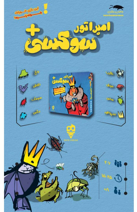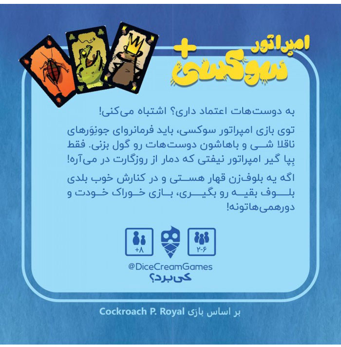 بازی فکری دایس کریم «امپراتور سوسکی +» به دوستاهات اعتماد داری؟ اشتباه میکنی! توی بازی امپراتور سوسکی،باید فرمانروای جونورهای ناقلاشی و باهاشون دوست هات روگول بزنی. فقط بپا گیر امپراتور نیفتی که دمار از روزگارت در می آره! اگه یه بلوف زن قهار هستی و در کنارش خوب بلدی بلوف بقیه رو بگیری، بازی خوراک خودت و دورهمی هاتونه! باید سعی کنی تا جای ممکن کارتهات رو به بقیه قالب کنی. توی این بازی باید یه بلوفزن قهار باشی و بتونی بازیکنهای دیگه رو گول بزنی. کسی که یه عالمه کارت بیاد دستش، می بازه!