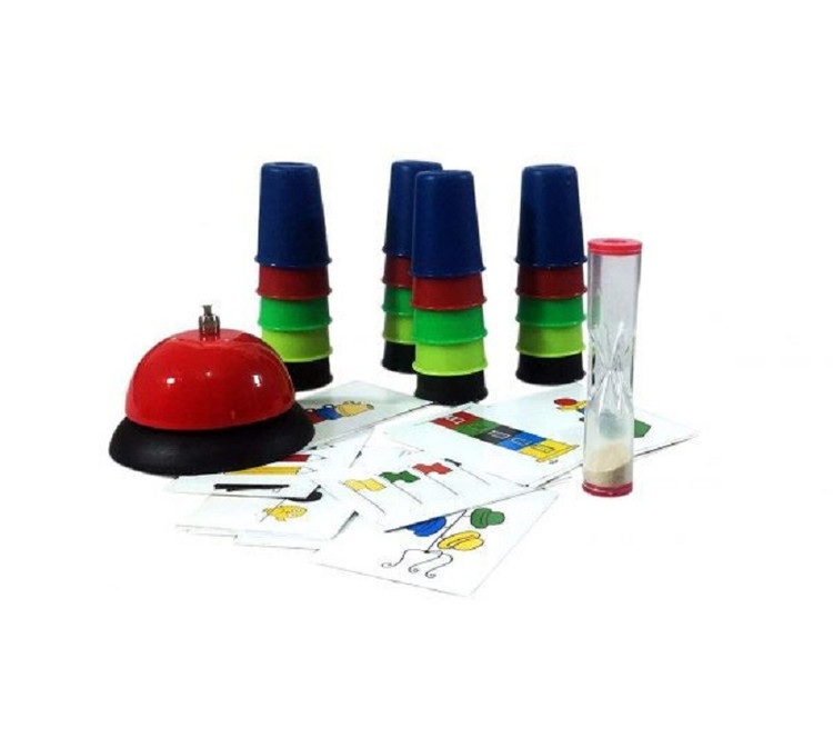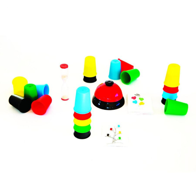 پک بازی فکری رنگچین شامل: 20 عدد لیوان کوچک در رنگ های مختلف، تعدادی کارت با الگوهای مختلف و یک زنگ است.