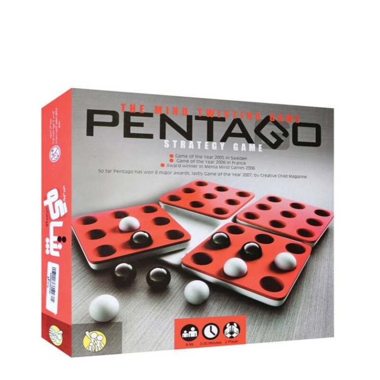 بازی فکری و ایرانی پنتاگو Pentago پنتاگو بازی فکری جذابی است که در سال 2004 طراحی شده است، و جوایز متعددی را به خود اختصاص داده است، یک بردگیم انتزاعی و استراتژی مطلق است که در آن دو بازیکن سعی دارند زودتر از یکدیگر، 5 مهره از رنگ خود را در یک راستای عمودی، افقی یا اریب، ردیف کنند. نکته جالب و هیجان انگیز این بردگیم، قابلیت چرخش 90 درجه صفحات در هر نوبت بازی است. یادگیری این بازی بسیار ساده ولی مهارت و استاد شدن در آن، احتیاج به زمان دارد. این بازی باعث: بالا بردن کارایی مغز - افزایش تمرکز فکر - افزایش هوش هیجانی - تقویت حافظه و کاهش احتمال ابتلا شدن به آلزایمر در پیری - افزایش توانایی قدرت حل مسئله - افزایش خلاقیت ذهنی میشود. رده سنی:8 سال به بالا تعداد بازیکن:2 نفر