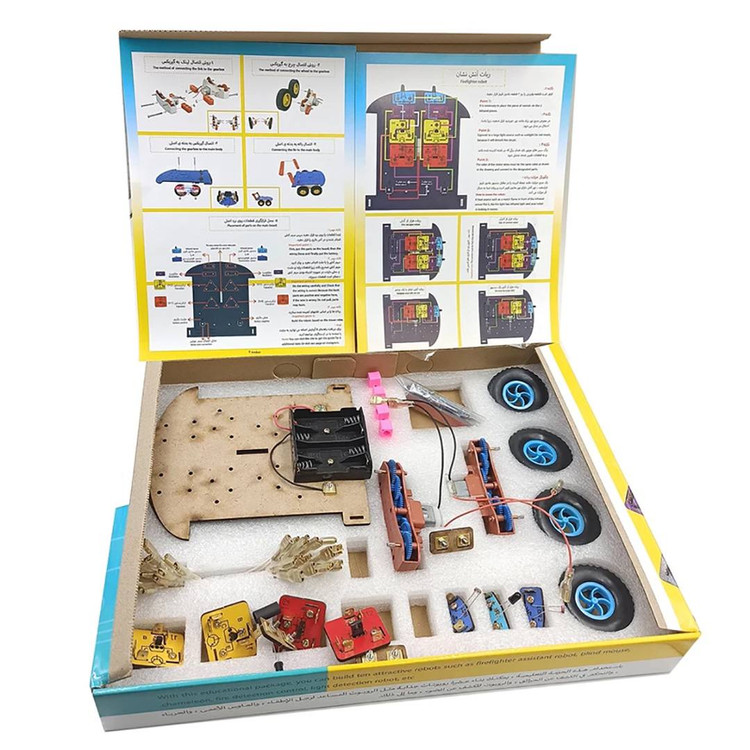 بسته آموزشی آزمایشگاه رباتیک شامل ساخت 10 ربات جذاب به همراه 5 ربات با کمک کیت آزمایشگاه الکترونیک می باشد. مدار های کاربردی بدون نیاز به لحیم کاری مناسب برای پروژه های دانش آموزی است. این کیت آموزشی برای کودکان 8 سال به بالا طراحی شده است.