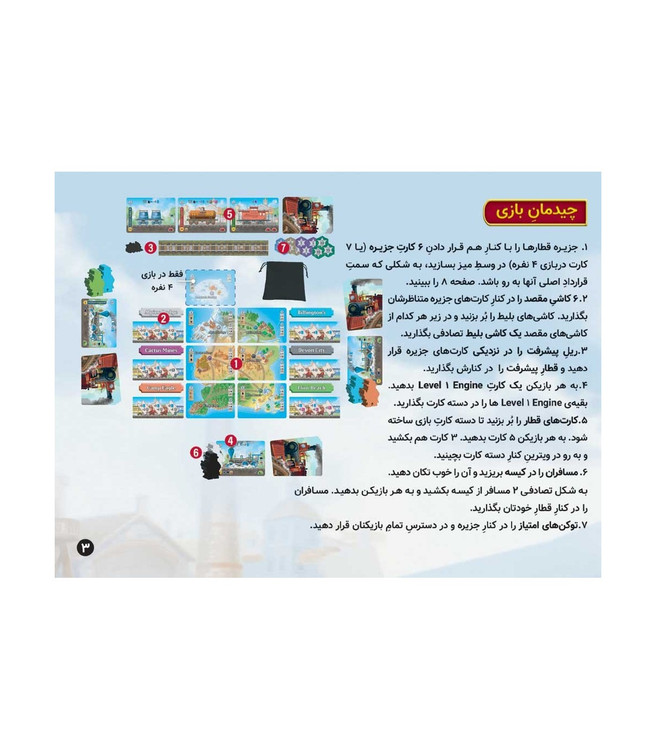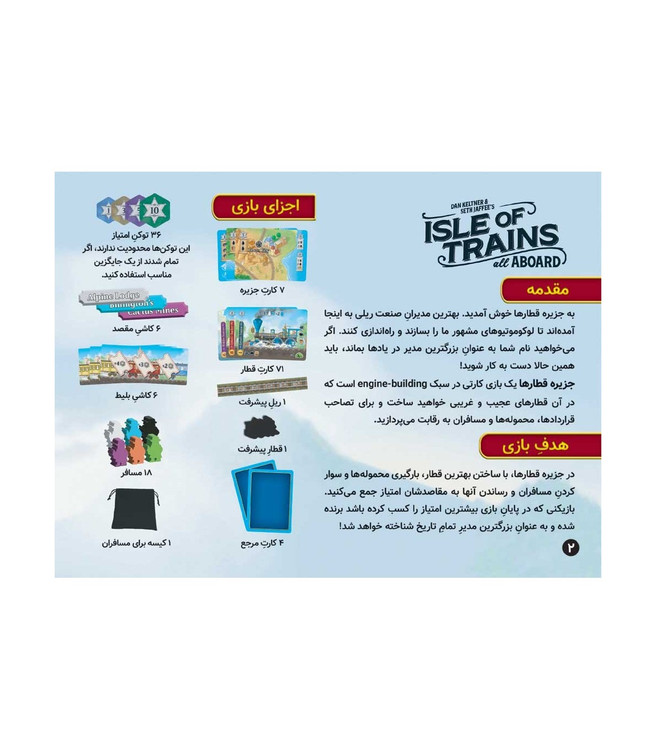 جزيره قطارها يک بازي در سبک Engine-building است که کارت هاي آن چند کاربرده هستند. براي کسب لقب بزرگترين مدير ريلي جزيره به رقابت با ساير بازيکنان بپردازيد. با واگن هاي باري و مسافربري متنوعي که در بازي هست قطاري بزرگ بسازيد و حريفان را اغوا کنيد تا مسافر و کالا در قطار شما بارگيري کنند. سپس آنها را به مقصد برسانيد و امتياز کسب کنيد!يا اينکه کالاها و مسافران خودتان را در قطار رقبا بارگيري کنيد تا از منفعت هاي با ارزش آن بهره مند شويد و بتوانيد اکشن ها را به بهترين شکل ممکن يکي پس از ديگري انجام دهيد و به پيش برويد.در جزیره قطارها، با ساختن بهترین قطار، بارگیری محمولهها و سوار کردنِ مسافران و رساندن آنها به مقاصدشان امتیاز جمع میکنید. بازیکنی که در پایانِ بازی بیشترین امتیاز را کسب کرده باشد برنده شده و به عنوانِ بزرگترین مدیرِ تمامِ تاریخ شناخته خواهد شد!