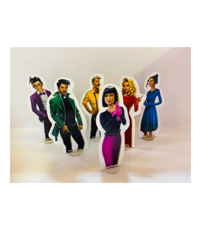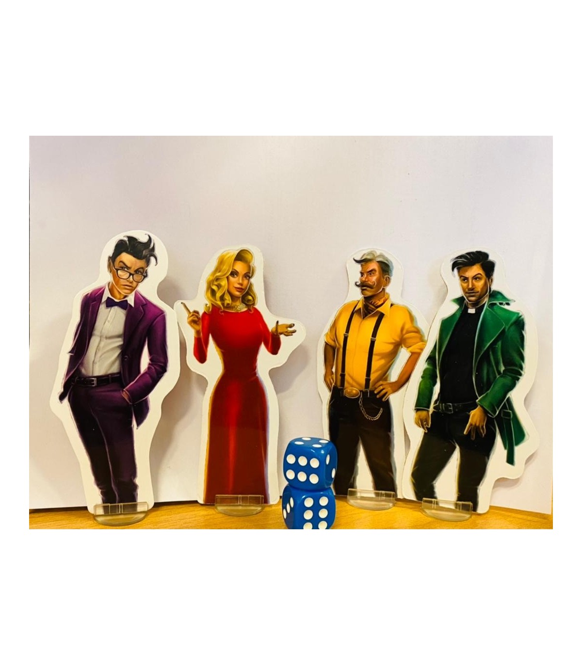 پروفسور پلام (بنفش)، وایت (سفید)، دوشیزه اسکارلت (قرمز)، پدر گرین (سبز)، سرهنگ ماسترد (زرد)، خانم پیکاک (آبی)، دکتر ارکید (صورتی)
